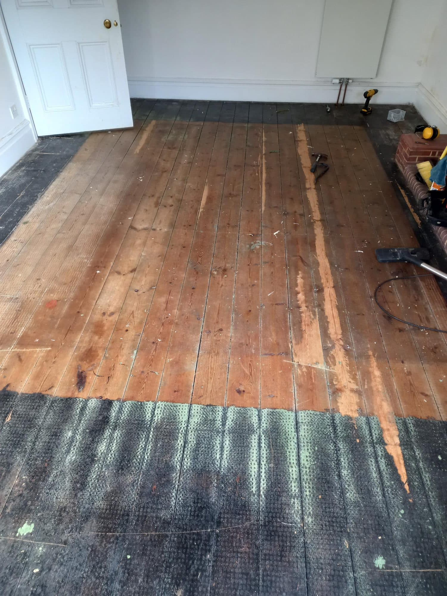 Last week I worked in Purley, and restored some very old-looking pine floorboards that had never been sanded before. First of all, I went around all of the floorboards to make sure that any squeaks were dealt with. This would usually be achieved by banging in the existing floor-brads a little further into the timber, or by putting some screws in place. The customer was keen to have the gaps between the boards filled, so I then used reclaimed pine slivers to fill the gaps, as resin filler generally ends up dropping through, and doesn’t usually stay in place. Doing this is very time consuming, firstly, strong wood glue needs to be poured into the gaps so that it coats the sides of the boards, a pine sliver is then hammered into the gap (the slivers are wedge-shaped and pointy on one side, to get between the boards). Once they are in place and the glue has dried, I then go around with a multi-tool, and I cut the parts of the slivers off that are sticking out above the boards. This is then followed by a full, dust-free sand, followed by a coat of Bona primer, and two coats of Bona Traffic Go varnish. As you can see from the pictures, I got an excellent result.